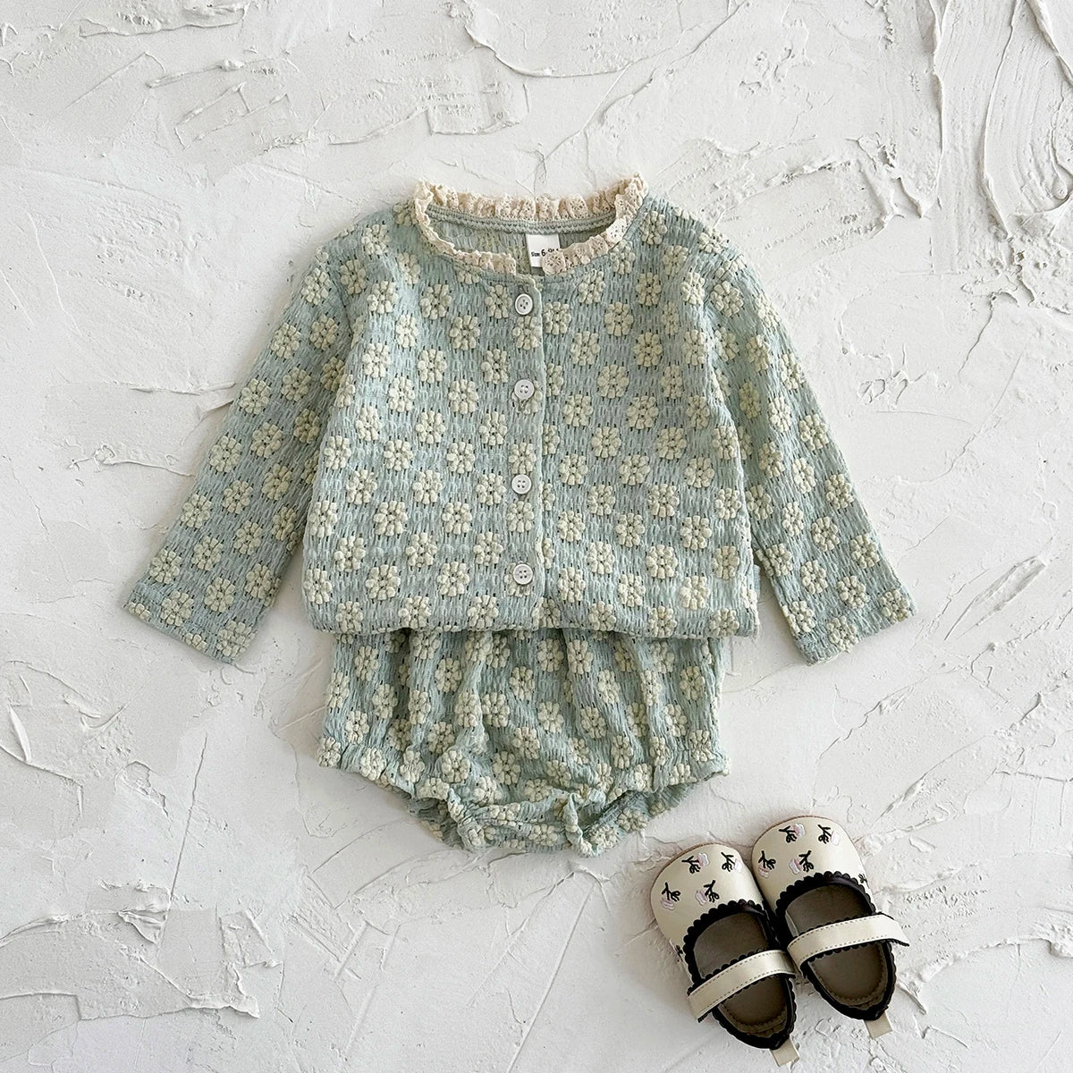 A beautifully crafted set designed for the sweetest little moments. This soft blue two piece features a delicately textured floral knit that feels as special as it looks. With a classic button-front cardigan and matching bloomers, it’s an easy, elevated outfit that’s perfect for everyday wear and milestone memories.