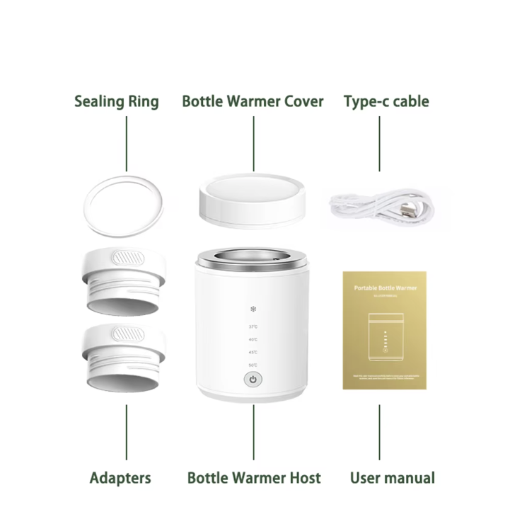 Everything you need for hassle free feeding! This set includes the portable bottle warmer, a protective cover, two versatile adapters to fit multiple bottle sizes, an innovative sealing ring for faster heating, a USB charging cable for on-the-go convenience, and an easy-to-follow user manual. Perfectly packaged to simplify your life!